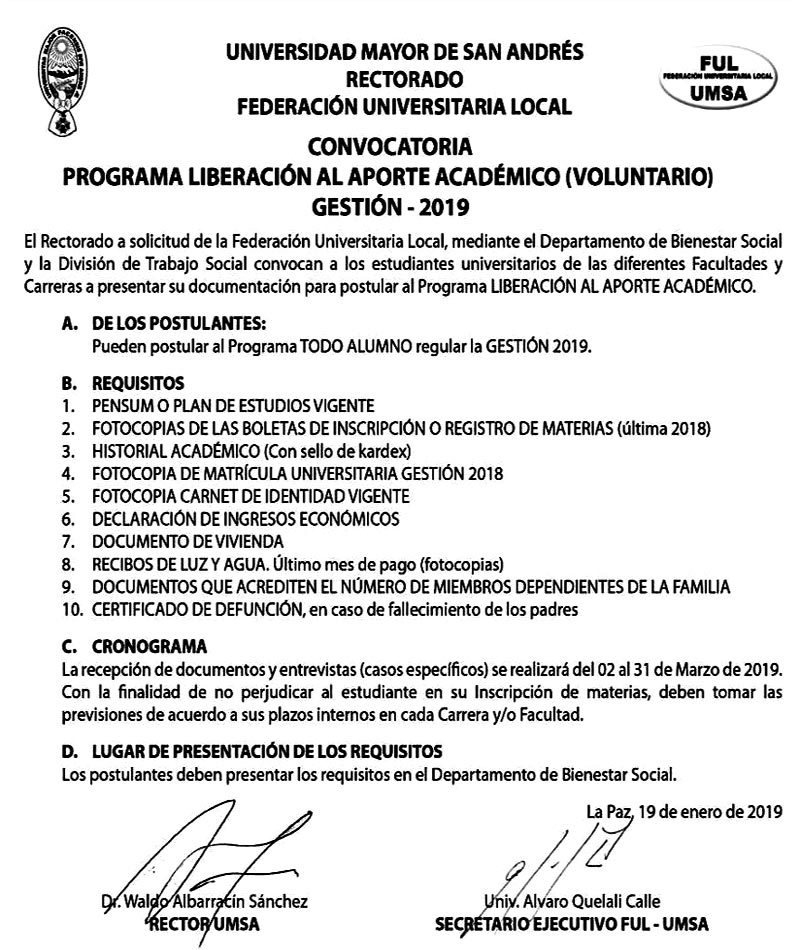 SE COMUNICA A LA POBLACION UNIVERSITARIA ESTUDIANTIL DE LA UMSA